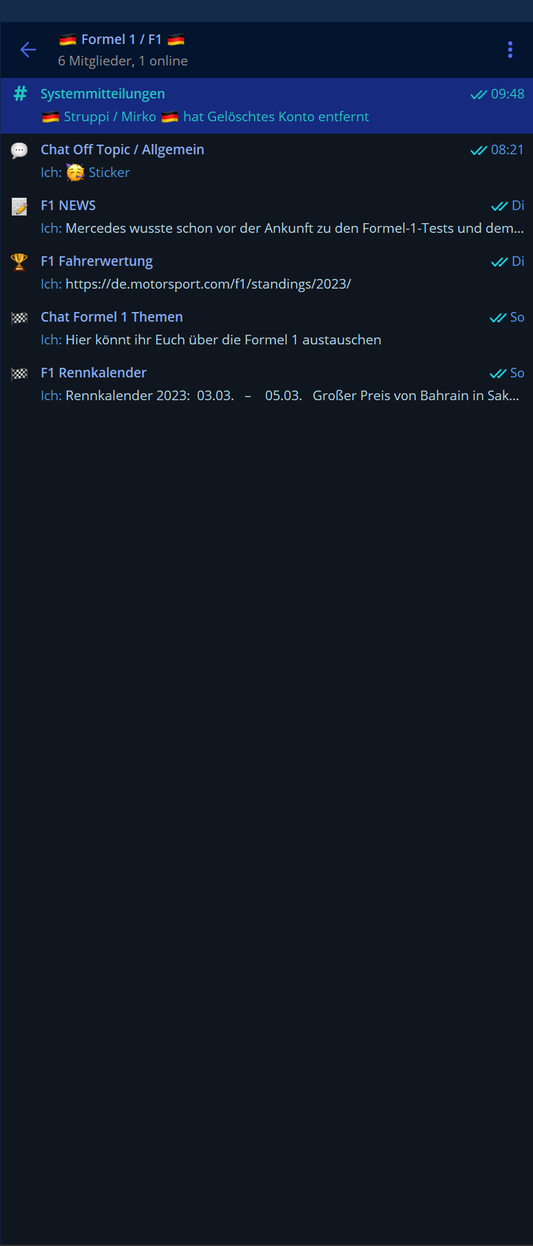 In dieser Gruppe könnt ihr Euch über die Formel 1 austauschen. News und Meinungen austauschen. Einen Chat gibt es auch.
